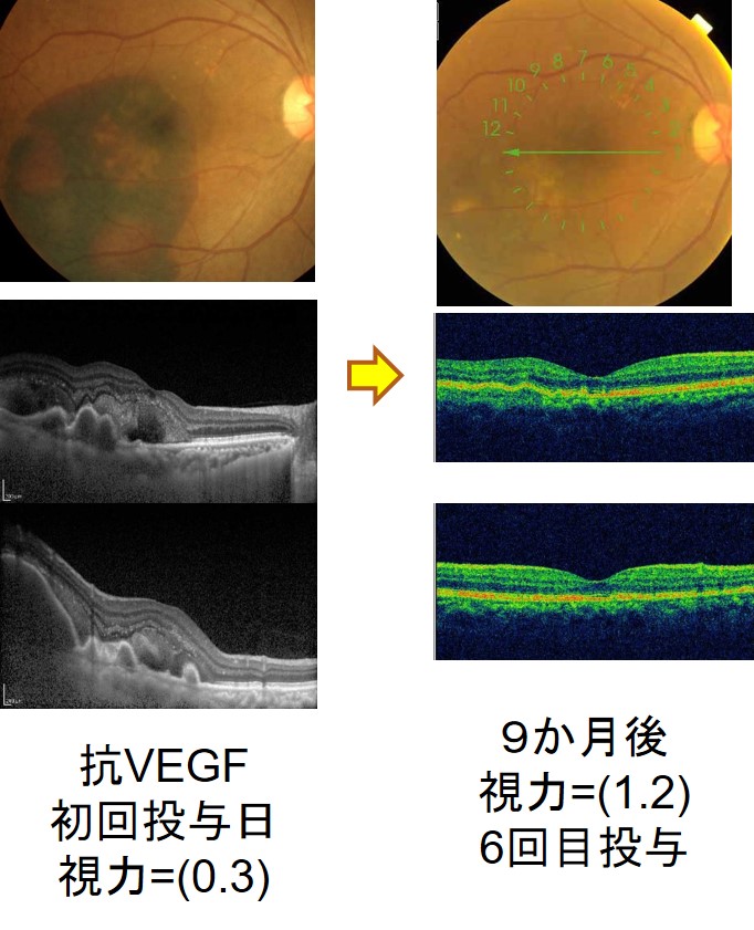 Therapy; PDT)という特殊なレーザー治療の登場によって悪化を抑制できるようになり、次いで抗VEGF療法という眼球注射療法によって視力の改善が可能となりました。当院でもこの抗VEGF療法を積極的に行っております。そして抗VEGF療法の効果が弱い場合は、先に述べたPDTという特殊レーザー治療が必要となりますが、こちらも。当院において治療提供可能です。