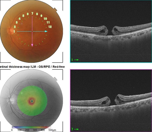 診断は大抵の場合、眼底検査とOCT検査で容易に可能です。治療は現在のところ、手術以外にはありません。手術は、硝子体茎離断術という方法で行います。黒目と白目の境界から3~4mmの位置に4か所小さな穴をあけ、眼球の内容の大半を満たしている硝子体を特殊な器具で取り除き、次いで黄斑円孔の周囲の網膜表面の「内境界膜」という薄い膜を特殊な細いピンセットで取り除きます。そして眼球内を空気あるいは1週間以上かけて少しずつ抜けていく特殊なガスに置換します。顕微鏡で眼球の中を覗きながら行う、非常に繊細な作業です。50歳代以上の方には、この手術を安全に効率よく行うために、白内障手術を同時に行うことをお勧めいたします。