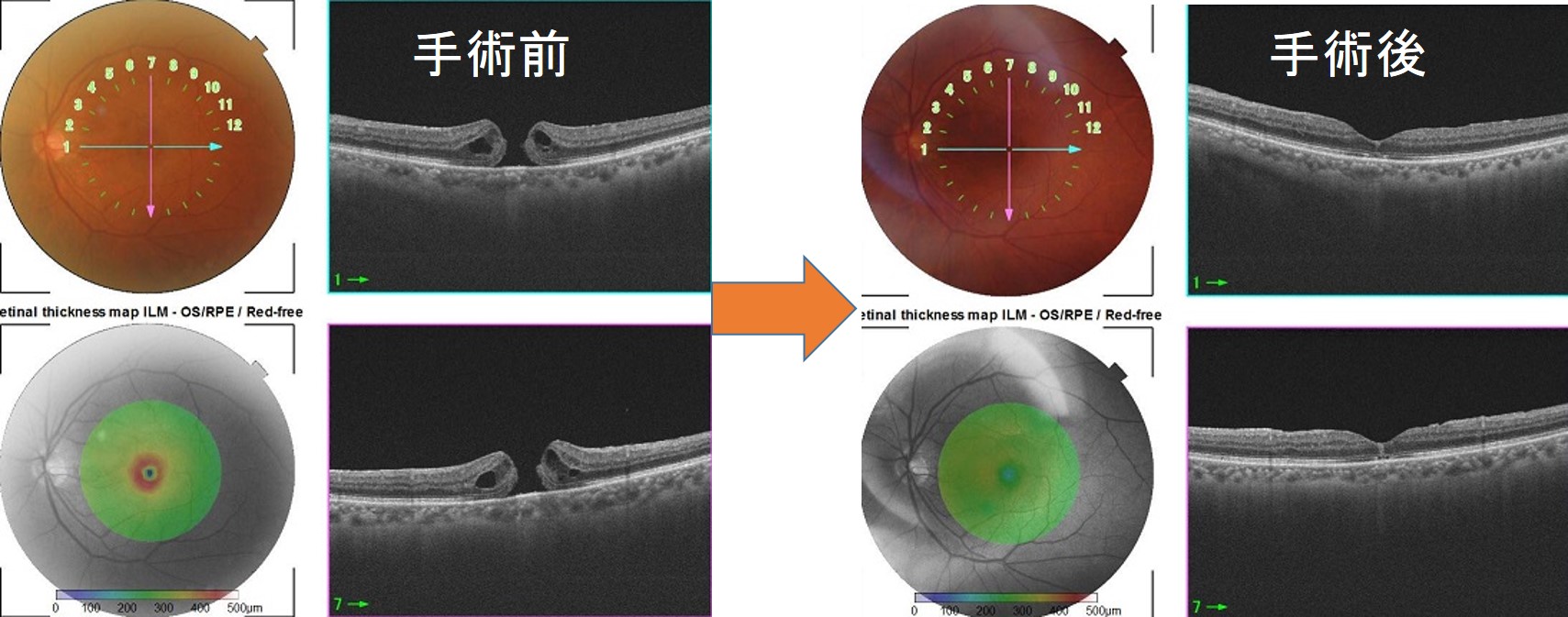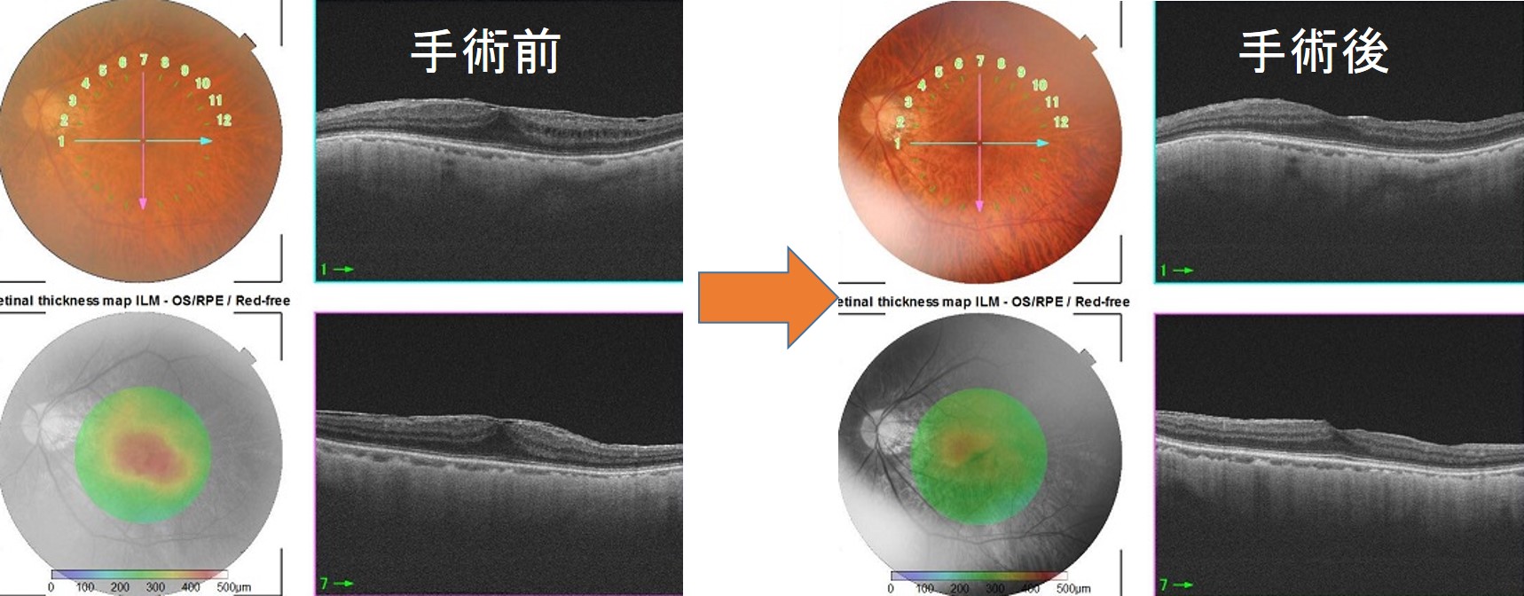 この病気で失明に至ることは稀ですが、悪化を止めるために硝子体手術でこの膜を取り除く治療が必要なケースがあります。この手術により多くの場合視力が改善しますが、「歪んで見える」などの症状が完全に消えるわけではないので、手術を予定する際には硝子体手術によるメリットを見極めてそれが大きいときに手術を選択するべきと考えます。当院では患者様の状態に合わせて個別によく相談したうえでこの手術を提供いたします。