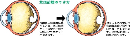 眼球の中身には硝子体と呼ばれるコラーゲン主体のゼリー状物質があり、若いころ(10~20歳代)には眼球の内容をほぼ満たしていて、硝子体と網膜はほぼ接着しています。しかし年齢による変化に伴い、硝子体は徐々に縮んでいき、網膜の表面から外れていきます。その際、網膜の中心部分である黄斑部で硝子体と網膜の接着が比較的強い人の場合、硝子体の一部を網膜の表面に残したまま硝子体の本体が網膜から外れてしまう場合があります。